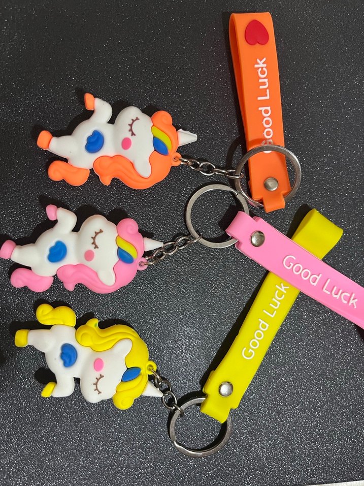 Elastik kayışlı, 'Good Luck' yazılı renkli unicorn anahtarlıklar, rock punk tarzına uygun.