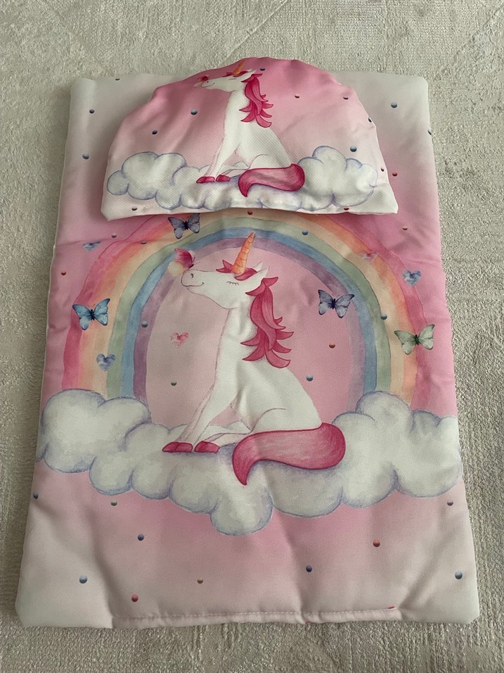 Çocuklar için pastel renklerde unicorn baskılı, gökkuşağı ve kelebek desenli yumuşak sentetik kumaştan uyku seti. Çok renkli tasarımıyla şık ve rahat. Hiç kullanılmadı