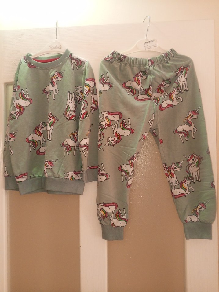 Gri renkli, uzun kollu ve yuvarlak yakalı kız eşofman takımı, yumuşak ve sıcak kumaştan, renkli unicorn baskılı ve örme manşetlidir. tertemiz az kullanıldı 4.5yaş