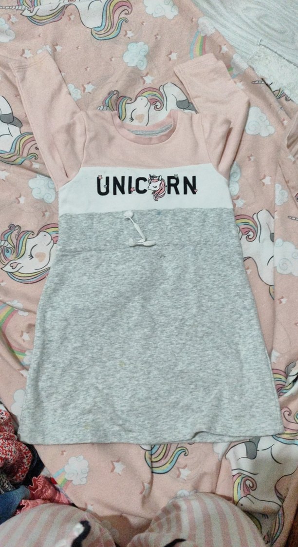Bu gri kız sweatshirtü uzun kollu, yuvarlak yakalı ve bol kesimdir. Göğsünde 'UNICERN' yazılı unicorn baskısı bulunur, yumuşak ve sıcak kumaştan üretilmiştir.Kucuk elbise 3 4 yas