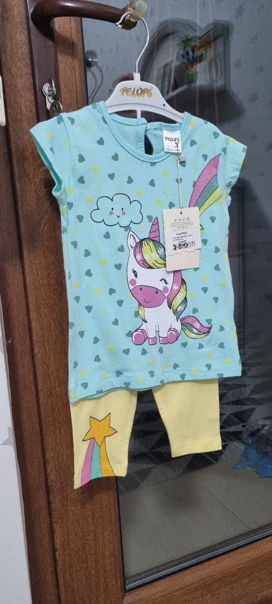 Unicorn baskılı, kısa kollu pastel renkli üst ve yıldızlı, gökkuşaklı sarı tayt içeren bebek takımı. Örgü kumaş yumuşaklık sağlar.