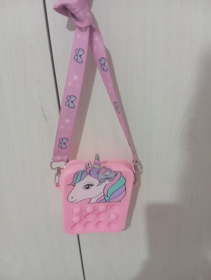 Pembe, unicorn baskılı ve tokalı kayışa sahip omuz çantası. Pastel tonlarda kelebek desenleriyle pop kültür tarzında tasarlanmıştır.