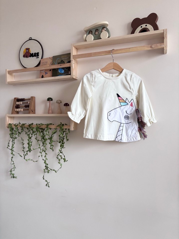 Ürün bedenleri: 12 ay, 18 ay, 2 yaş Pamuklu, beyaz uzun kollu kız elbisesi, bol kesim ve unicorn baskılıdır. Yanlarındaki saçak detayı elbiseye oldukça şık bir hava katıyor.
