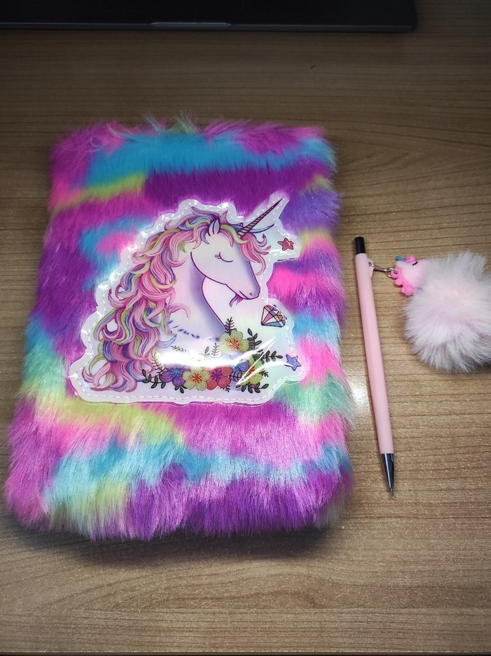 Yumuşak peluş kaplı, renkli unicorn desenli defter ve ponponlu pembe kalem. // Hiç kullanılmamış