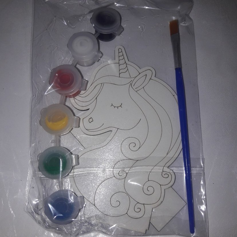 Bu boyama setinde unicorn desenli bir taslak, çeşitli açık canlı renk boyalar ve detaylı çalışma için fırça bulunmaktadır.