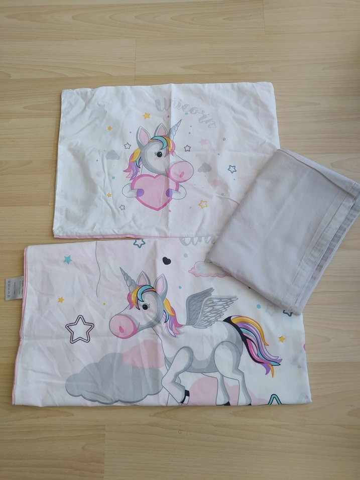 Pastel gri sentetik kumaştan yapılmış, unicorn desenli Yastık kılıfı Carsafi da hafif solma var