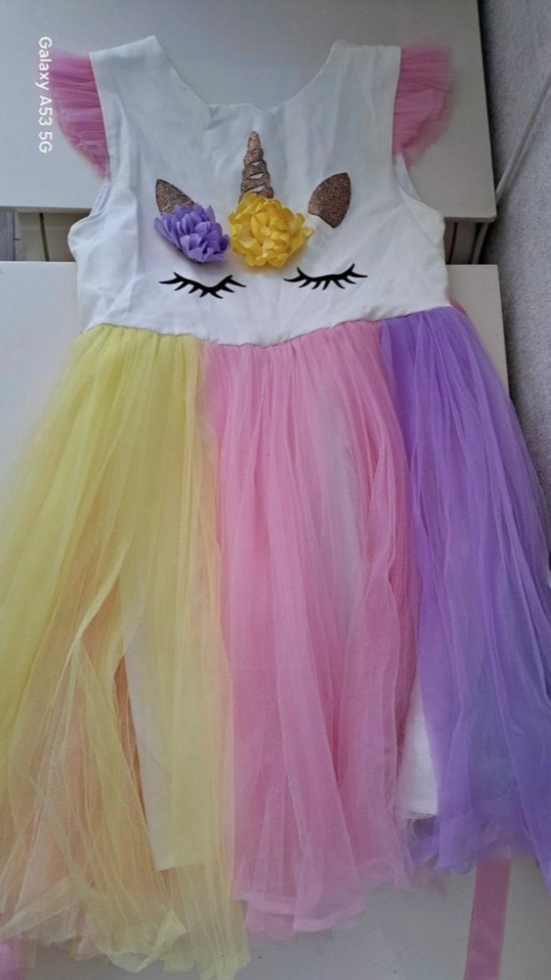 Kız çocuk elbisesi, kolsuz ve yuvarlak yaka tasarıma sahip. Üstünde unicorn yüz deseni ve çiçek detayları bulunur. Sarı, pembe ve mor pastel tül etekleriyle bohem ve retro tarzda, bol kesimdir.