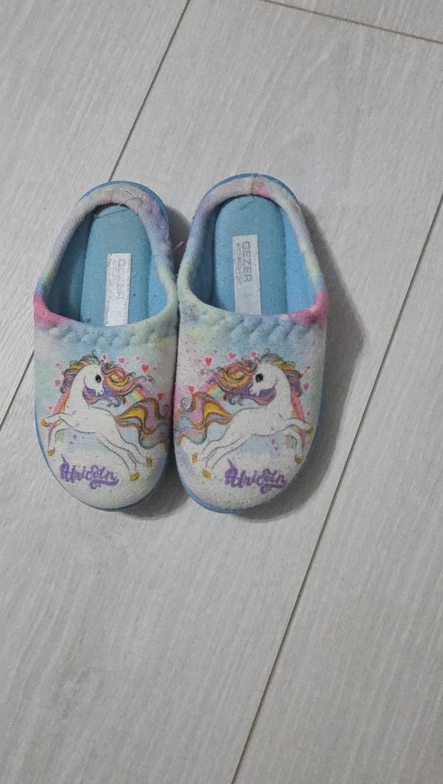 Yumuşak kumaştan, pastel tonlarda batik desenli, unicorn baskılı kız çocuk ev terliği. Kolay kullanımlı cırt cırtlı bantlıdır.