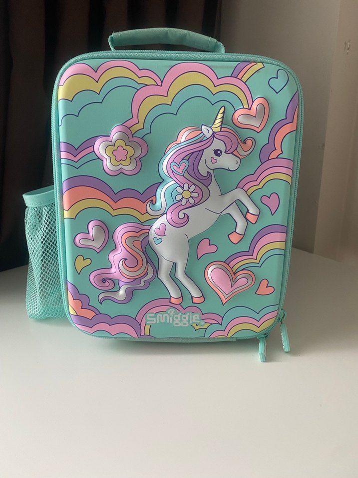 ‼️SMIGGLE ‼️Unicorn ve kalp desenli pastel renklerle tasarlanmış çocuk beslenme çantası ve bus pass 2 ürün ilanı.