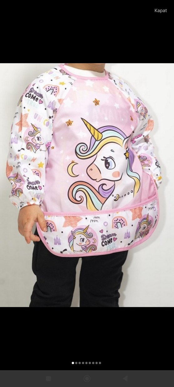 Pastel pembe renkli, uzun kollu ve unicorn baskılı bebek önlüğü. Yemek sırasında kıyafetleri korumak için yumuşak kumaştan yapılmıştır.