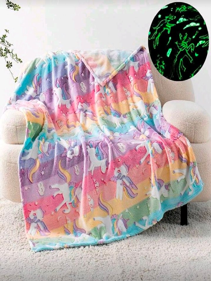 Unicornlu tv battaniyesi.70*100 pastel renklerde batik desenli, unicorn figürlü ve karanlıkta parlayan yumuşak ve sıcak kumaştan yapılmış battaniye.