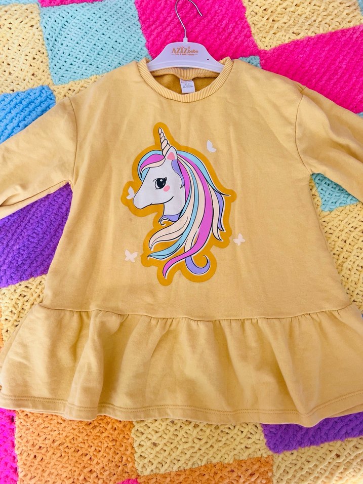 Sarı renkli, yumuşak örme kumaştan yapılmış uzun kollu kız tişörtü. Renkli unicorn baskısı ve fırfırlı etek ucu, bol kesim ve yuvarlak yaka özellikleriyle.tam kışlık güzel elbise.çok küçük belirgin olmayan bir leke var. Fiyatı uygun tutuyorum.3-4 yaşauygundur