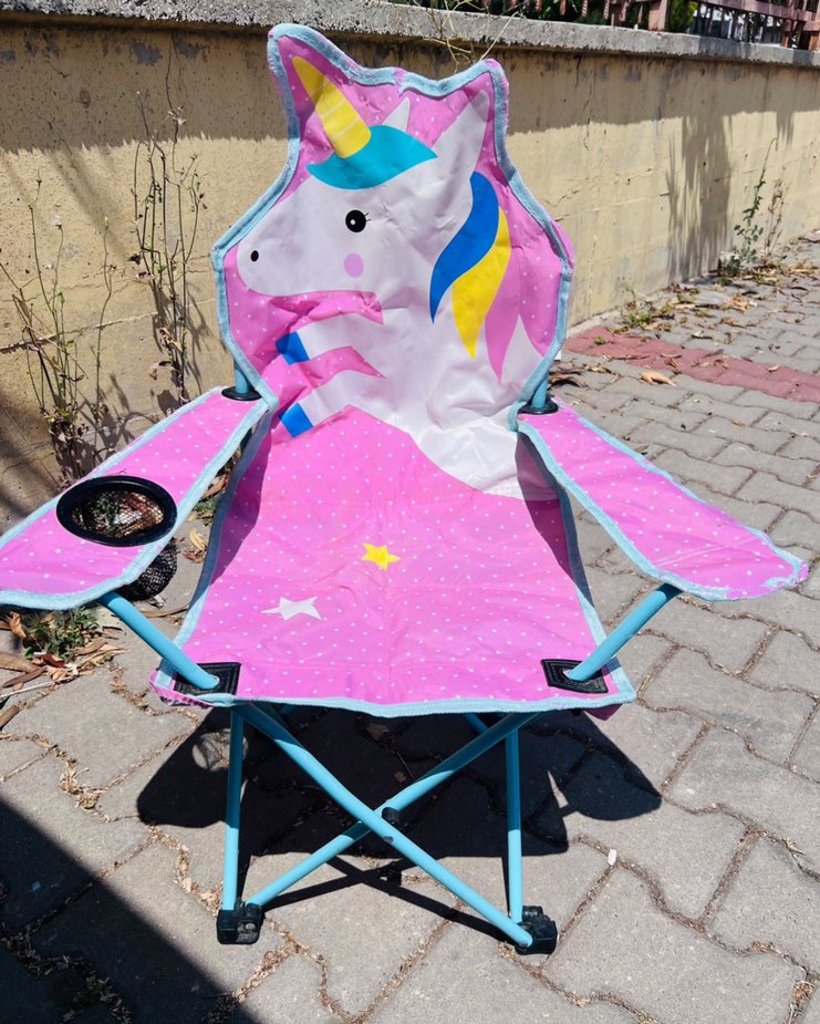 Pastel pembe renkte, unicorn figürlü, katlanabilir çocuk sandalyesi. Kol dayama kısmında bardak tutucu bulunur. Hafif yapısı ile dış mekan kullanıma uygundur.