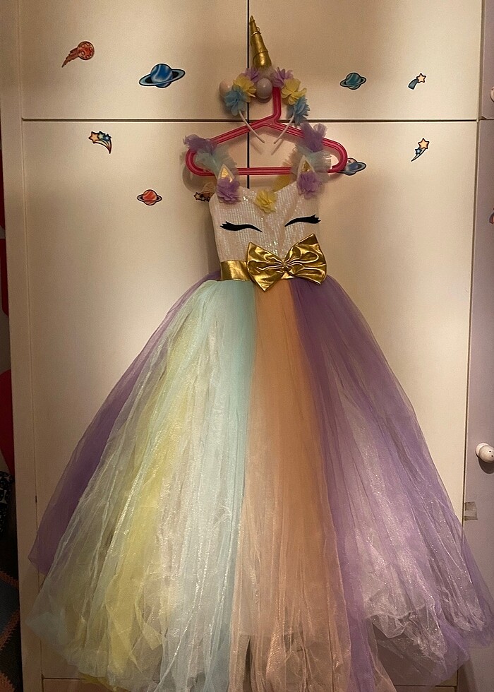 unicorn kız çocuk prenses parti doğum günü elbise kostüm 8-9 yaş taç ile birlikte (10 yaşa da oluyor fotodaki gibi)