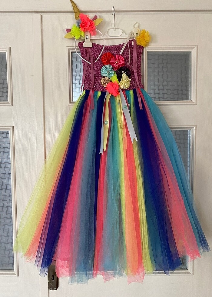 Rengarenk çok tatlı bir kostüm Tertemiz sorunsuz çok az giyildi gönül rahatlığıyla alabilirsiniz, üst kısım ve beli lastikli, boyundan bağlamalı, belden aşağı boyu 65 cm, tacı ve bilekliği var