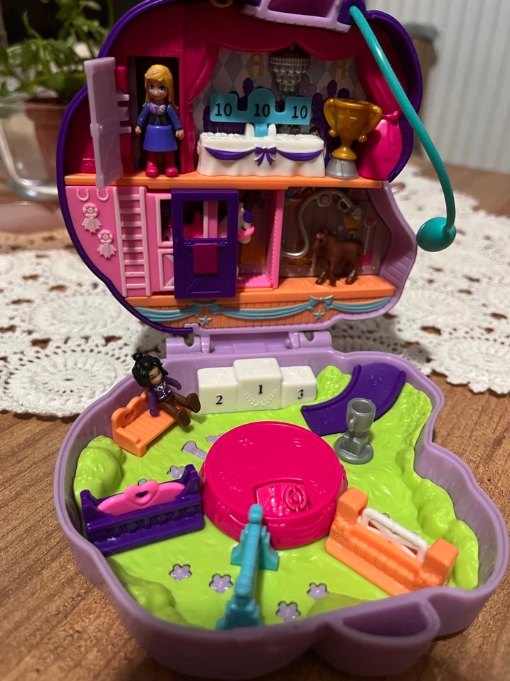 Mor renkli küçük oyun seti, içinde minyatür figürler, mobilyalar ve kupa bulunur. Numaralı bloklar ve eğlenceli detaylar içerir. 2 karakter bir at ve tay bulunmaktadır sıfırdan farksızdır Nadide bir oyuncak