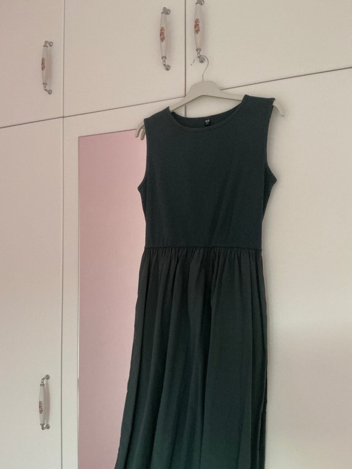 Uniqlo marka midi koyu yeşil elbise
