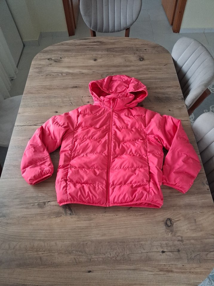11.12 yaş sorumsuz kullanılmış boy 57 cm iki koltuk arası 49 cm kız çocukları için kapüşonlu, fermuarlı ve yumuşak, sıcak kumaştan yapılmış pembe monttur. Düz ve renkli tasarıma sahiptir.