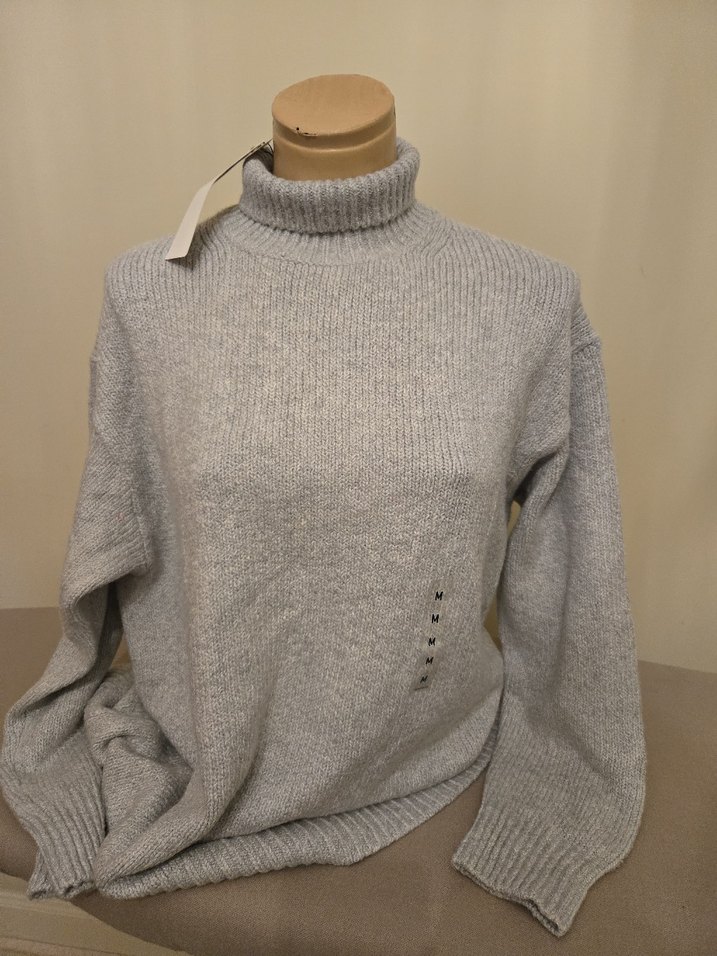Gri renkli, örme dokulu, boğazlı ve uzun kollu kadın kazak. Rahat ve bol kesimiyle günlük kullanıma uygundur.