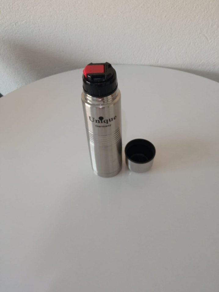 Unique markalı gri termos , içecekleri sıcak veya soğuk tutar. Güvenli kapak ve çıkarılabilir bardak içerir. Çocuklar için uygundur. ☕