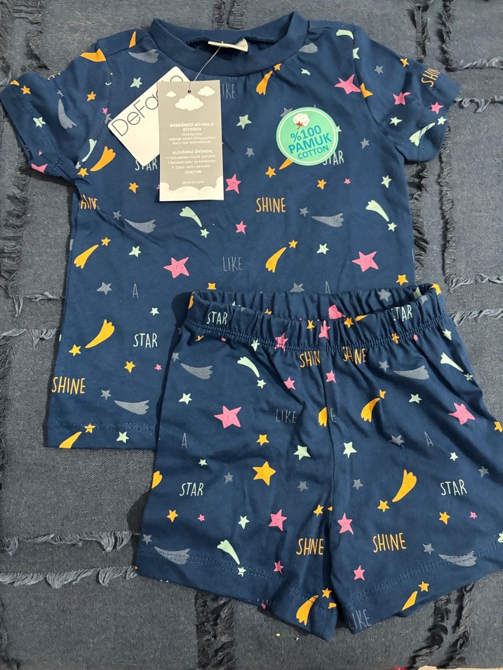 Çocuklar için koyu mavi renkte, renkli yıldız ve yazı baskılı pijama takımıdır. Malzemesi sentetik kumaştır ve rahat uyku sağlar. ⭐