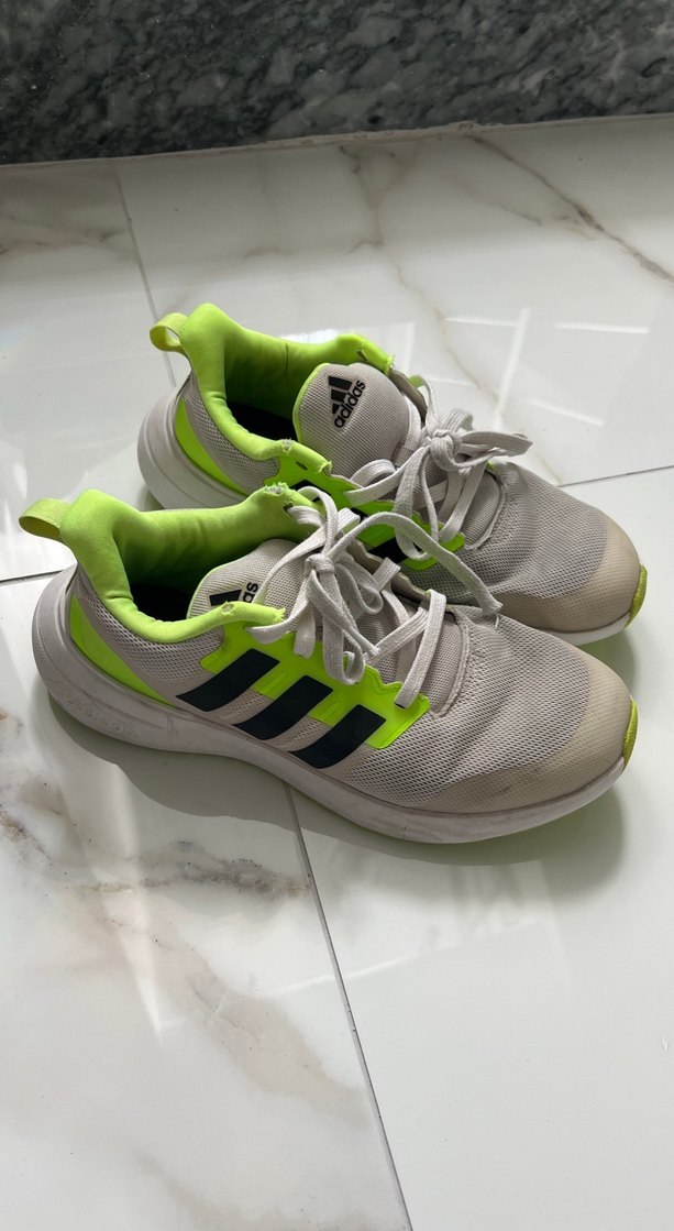 Beyaz Adidas bağcıklı spor ayakkabılar, gri şeritler ve neon yeşil detaylarla sokak tarzına uygun. Dayanıklı ve rahat kauçuk tabanlı. 38 numara, hem kadına hem erkek çocuklar kız çocuklar için ideal.