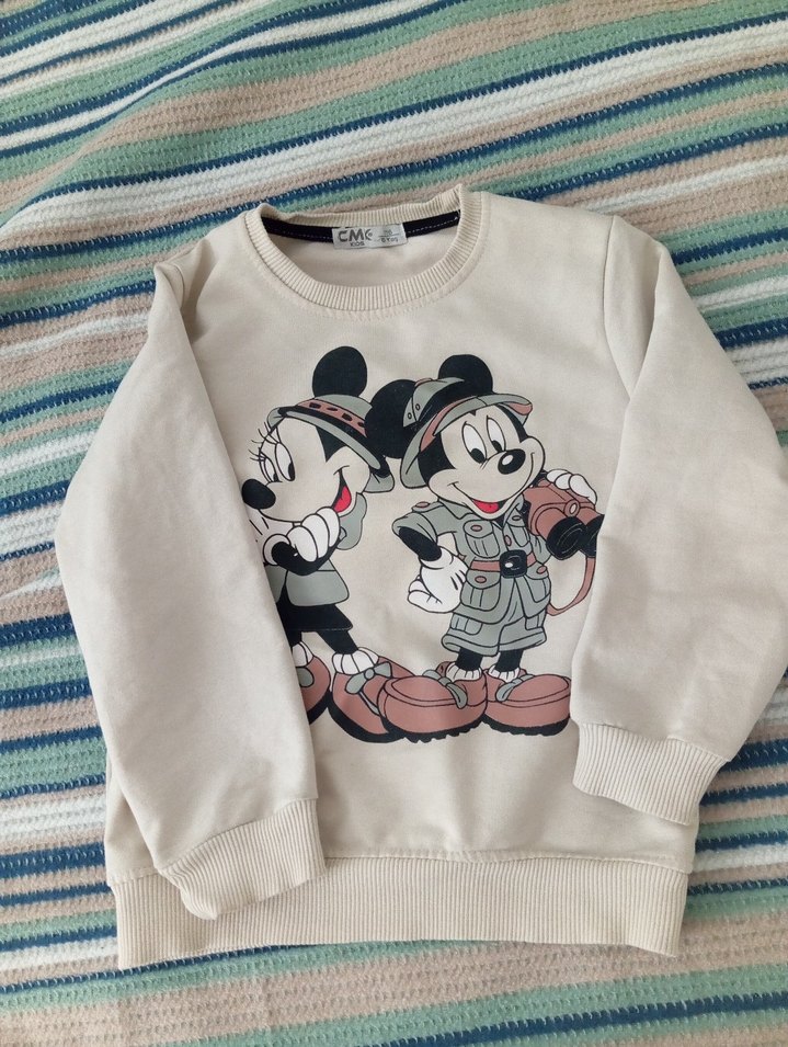 Uzun kollu, beyaz pamuk unisex sweatshirtü, bol kesim ve yuvarlak yaka. Örgü dokusu ve baskılı çizgi film deseniyle dikkat çeker. Trendy gündelik kullanım için uygun.