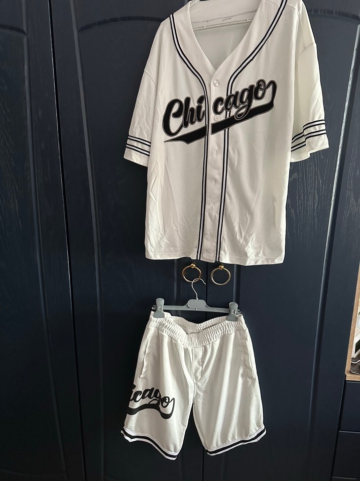 Pamuk kumaştan, kısa kollu ve bol kesim erkek spor takımı. Üstte ve şortta baskılı Chicago yazısı bulunur. Günlük kullanıma uygundur. ⚾
