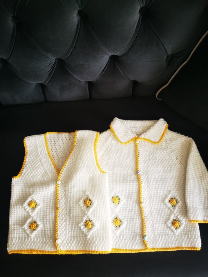 Beyaz renkli, sarı renkli yelek ve uzun kollu el örgüsü hırka seti. Kız ve erkek çocuklar için, rahat kesim ve klasik tarzda örülmüştür.