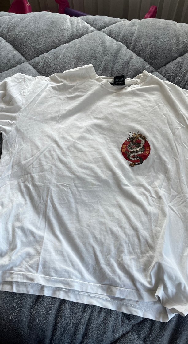 Beyaz pamuklu, kısa kollu, yuvarlak yakalı ve bol kesim tişört. Göğüste baskılı ejderha detayları bulunur. Rahat günlük kullanım için uygundur. Herhangi bir lekesi yoktur S bedendir. Açıklamadaki marka temsilidir.