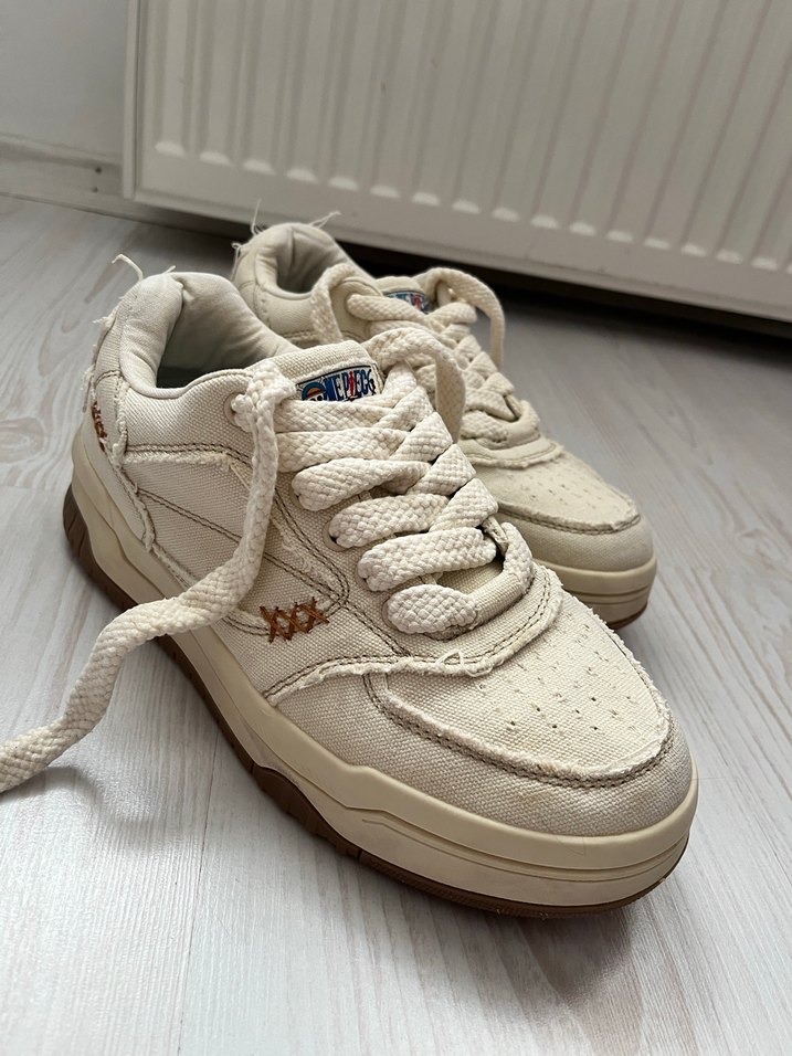 Unisex i platform topuklu, pastel beyaz renkte ve nakış detaylı spor ayakkabılar. Kalın bağcıklar ve kauçuk tabana sahiptir, spor ve günlük kullanım için uygundur.