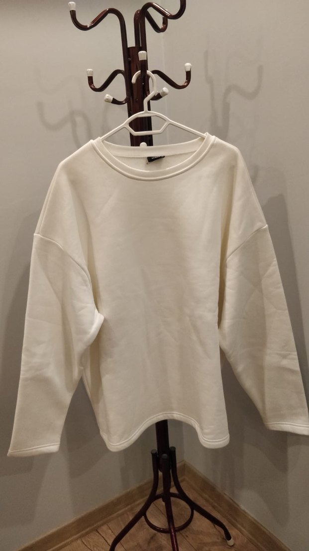 Beyaz renkte, yuvarlak yaka ve uzun kollu, salaş kesim sweatshirt. Yumuşak ve sıcak kumaştan, günlük kullanım için minimalist sokak stili sunar.
