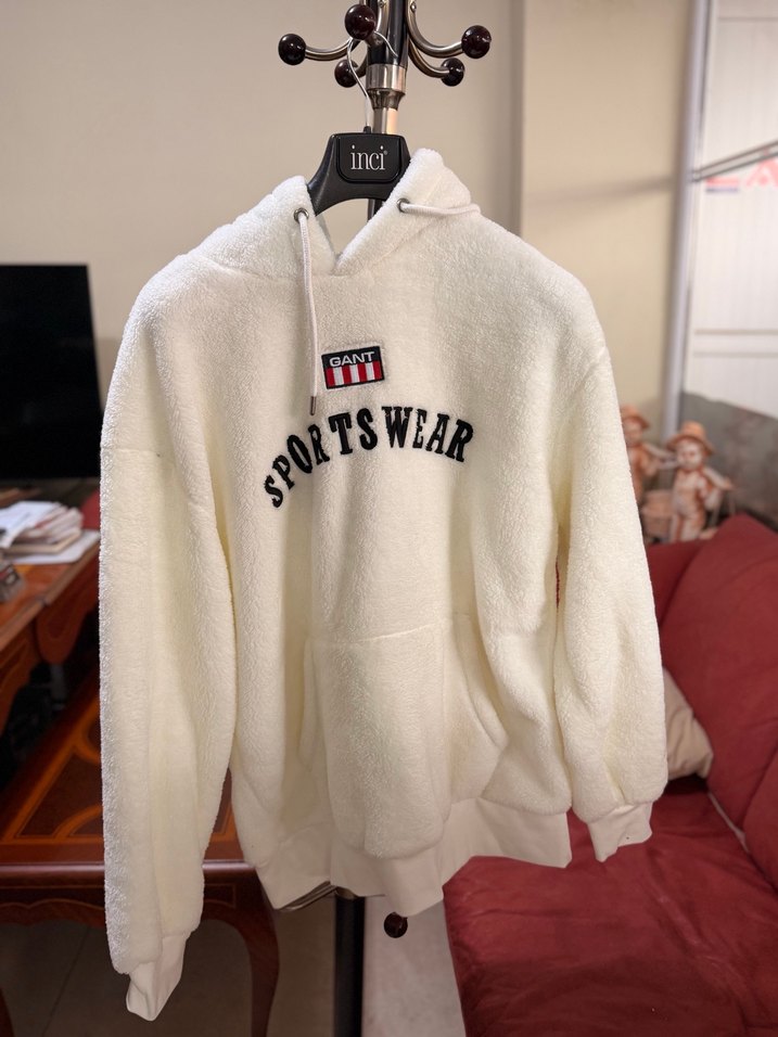 Beyaz sweatshirt, bol kesim, uzun kollu ve yuvarlak yaka. Yumuşak, kürklü detaylı kumaştan, önünde baskılı sportswear yazısı bulunur. Kısa boy, rahat ve trend tarz.