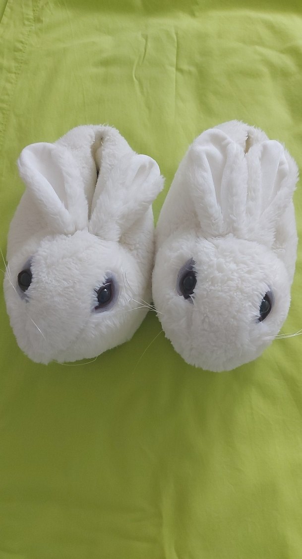 beyaz tavşan figürlü, yumuşak kürk detaylı sıcak terlikler. Pastel tonlarda, sade ve pop kültür tarzında, ev içinde rahat kullanım sağlar.