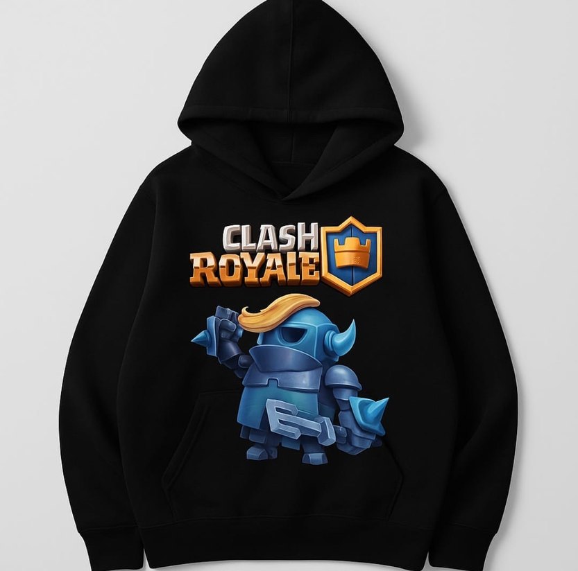Siyah renkli, kapüşonlu, uzun kollu ve bol kesim erkek sweatshirt. Yumuşak fleece kumaş üzerine Clash Royale baskısı ve zincir detayları bulunur.