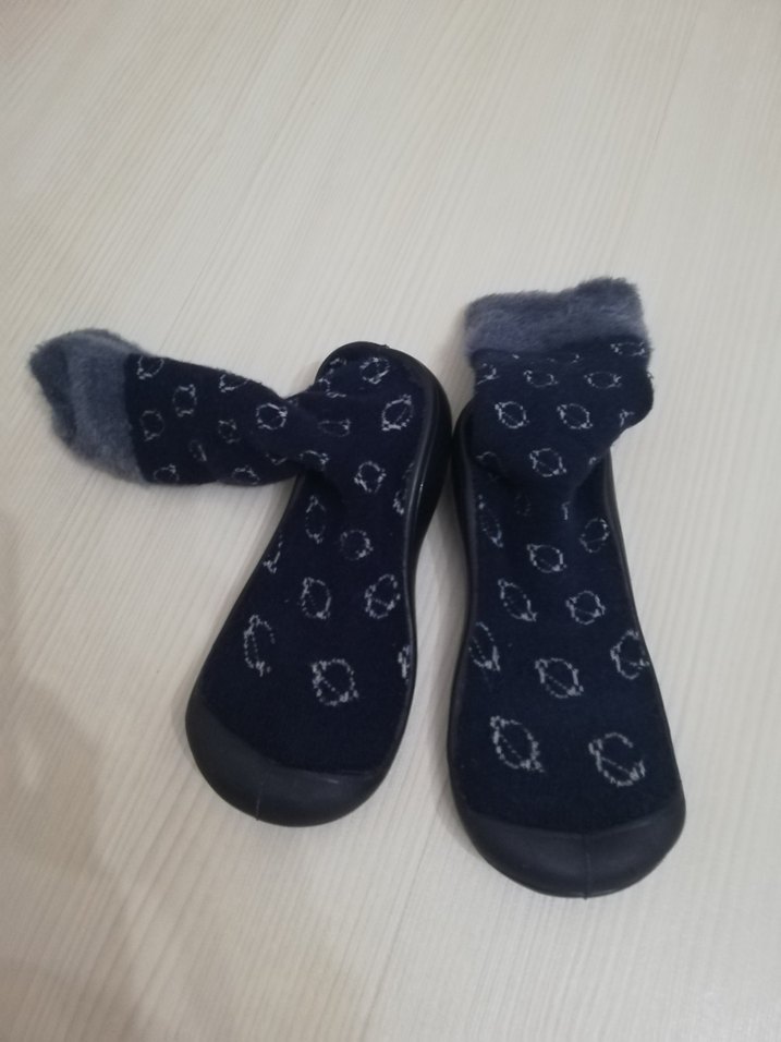 Gri ve mavi renklerde, örgü yapılı bağlamalı desenli, yumuşak ve sıcak kürklü unisex çocuk terliği, dayanıklı tabanlıdır.