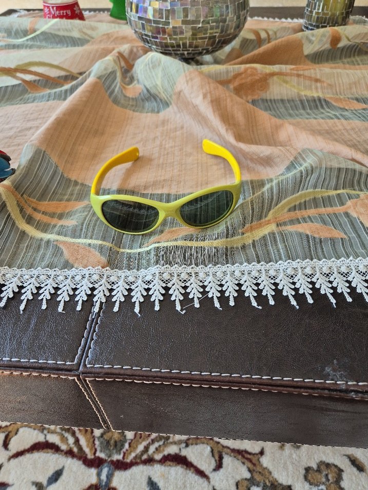 Sapları sarı, çerçevesi açık yeşil çocuk güneş gözlüğü. Canlı sarı çerçeve, farklı bir görünüm sağlar. 3-7 yaş arası kullanılabilir. Gözlükçüden almıştım. Camları çok kaliteli.