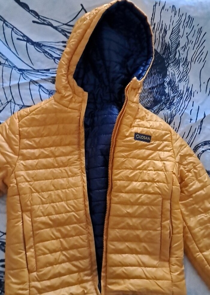 Çift taraflı giyilebilir çocuk montu çok iyi durumda lacivert ve sarı renk