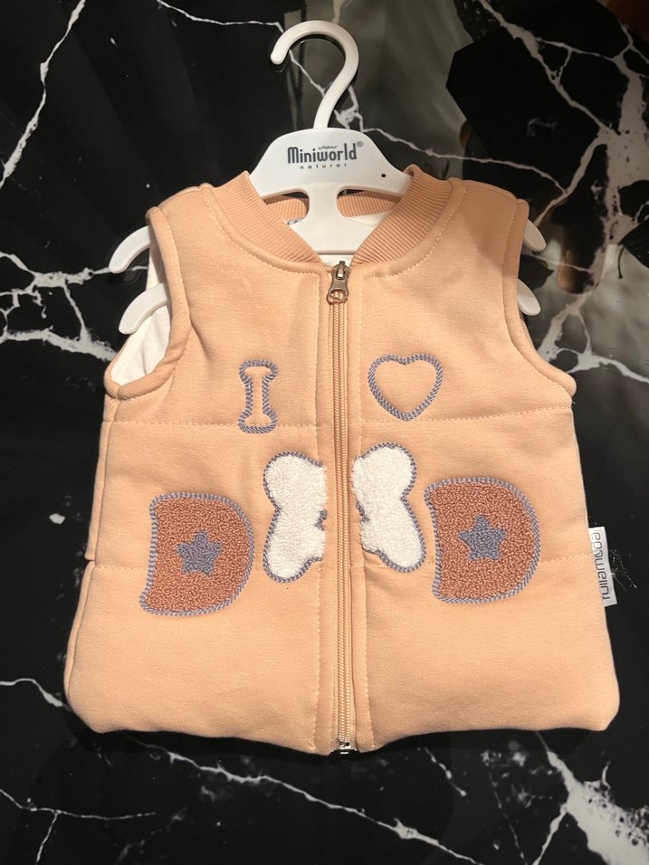 Unisextir. çocuklar için örgü nakışlı, kolsuz ve fit kesim yelek. Yumuşak, sıcak pastel kahverengi kumaştan, Miniworld markalı, günlük sokak stiline uygun.