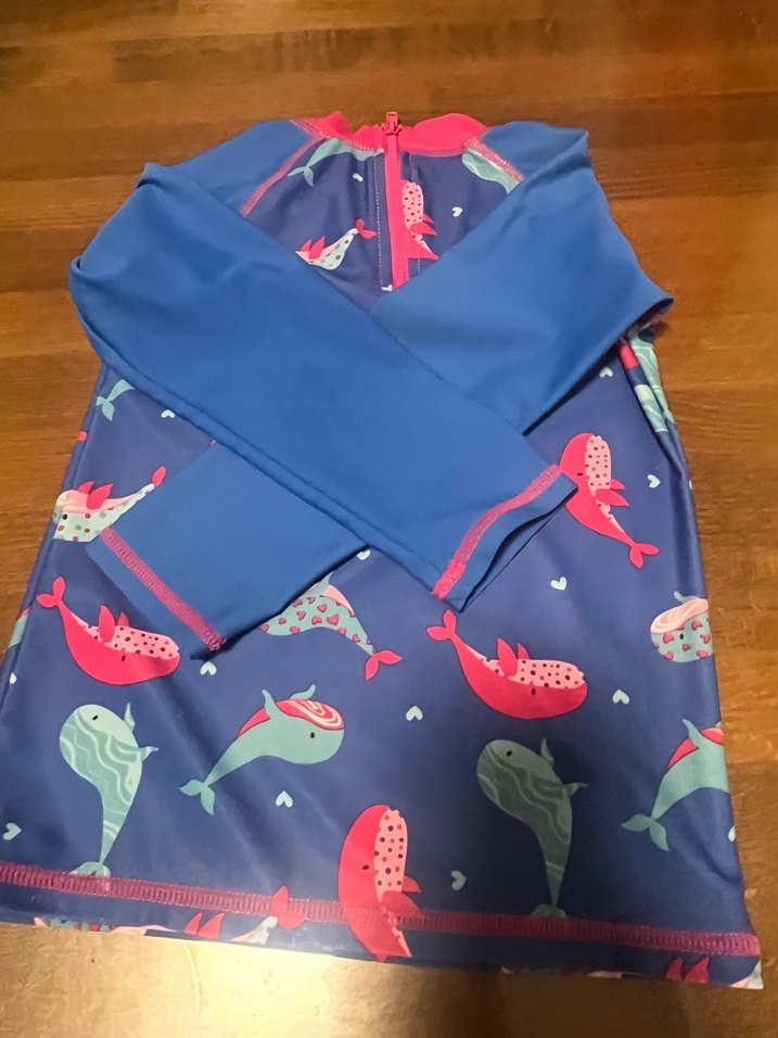 Uzun kollu, koyu mavi renkli, renkli deniz canlıları baskılı çocuk mayo üstü. Arkasında kolay giyilmesi için fermuar bulunur.