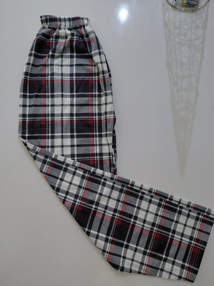 düzenli kesim, midi boy, koyu çok renkli ekose desenli sentetik kumaştan yapılmış, pileli rahat ve şık kumaş pantolon. Günlük kullanıma uygundur.