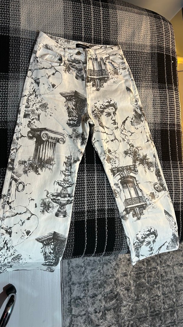Gri ve beyaz baskılı, geniş kesim ve uzun paçalı unisex bol pantolon . Günlük kullanıma uygun, tekstil kumaştan üretilmiştir.