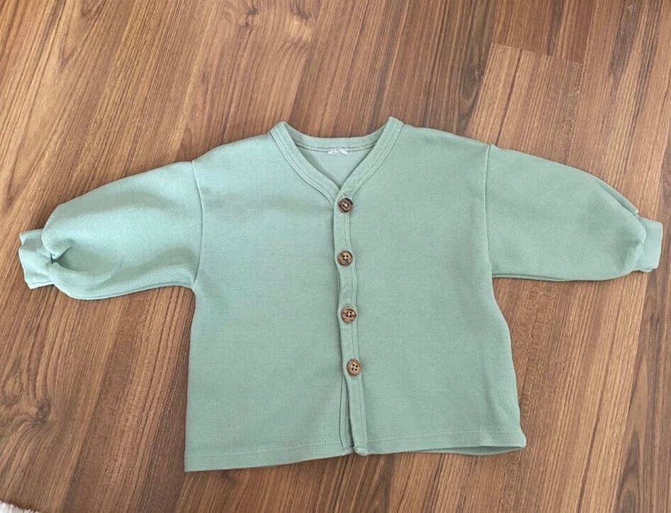 Düğmeli, uzun kollu ve bol kesim unisex bebek hırkası, yumuşak pastel renkte, rahat dokulu. Etiketi rahatsız olmasın diye kesildi. 3-6 ay yazıyor ama bebeğiniz çok şişman değilse 9 aya kadar rahatlıkla kullanılabilir. Çok temiz kullanıldı. Hiçbir kusuru yok.