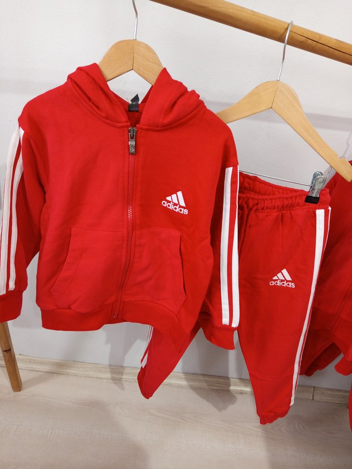 Yumuşak kumaştan, fermuarlı kapüşonlu ve yan şerit desenli kırmızı eşofman takımı, rahat ve renkli sokak stili sunar. ♂️ 2-6 yaş arası