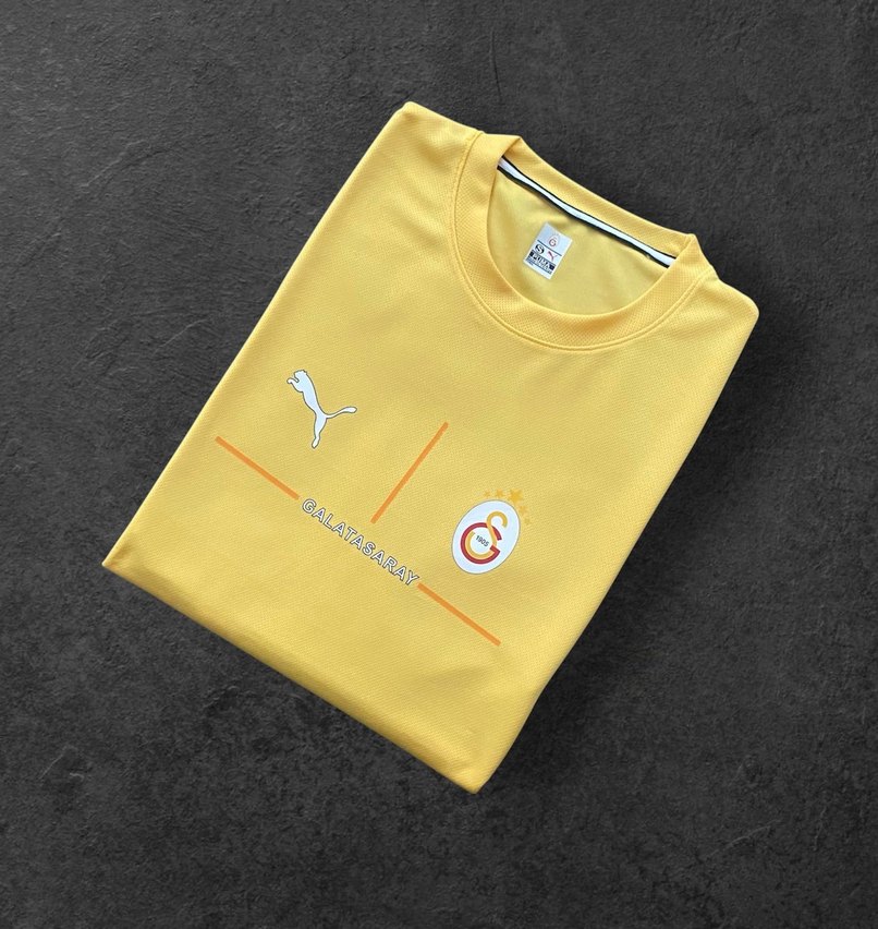 Sarı renkli, Galatasaray baskılı tişört. Kısa kollu, yuvarlak yaka ve sentetik kumaştan üretilmiştir. Renkli baskılar ve logo detayına sahiptir.