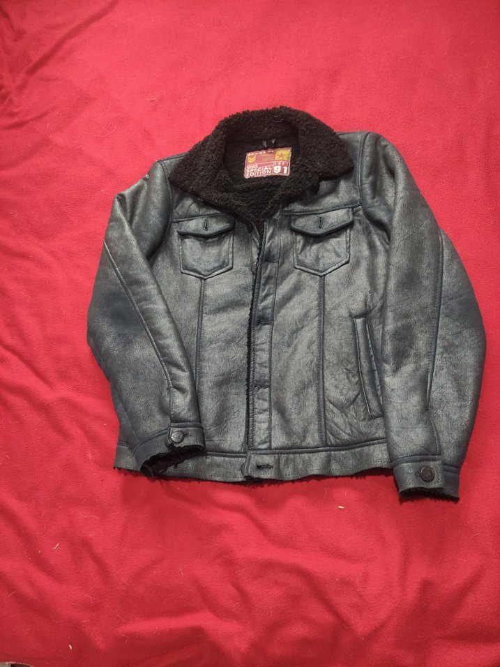 unisex gri renkte, düğmeli detaylı, yakalı ve deri görünümlü dar kesim ceket. İç kısmı yumuşak astarlıdır.