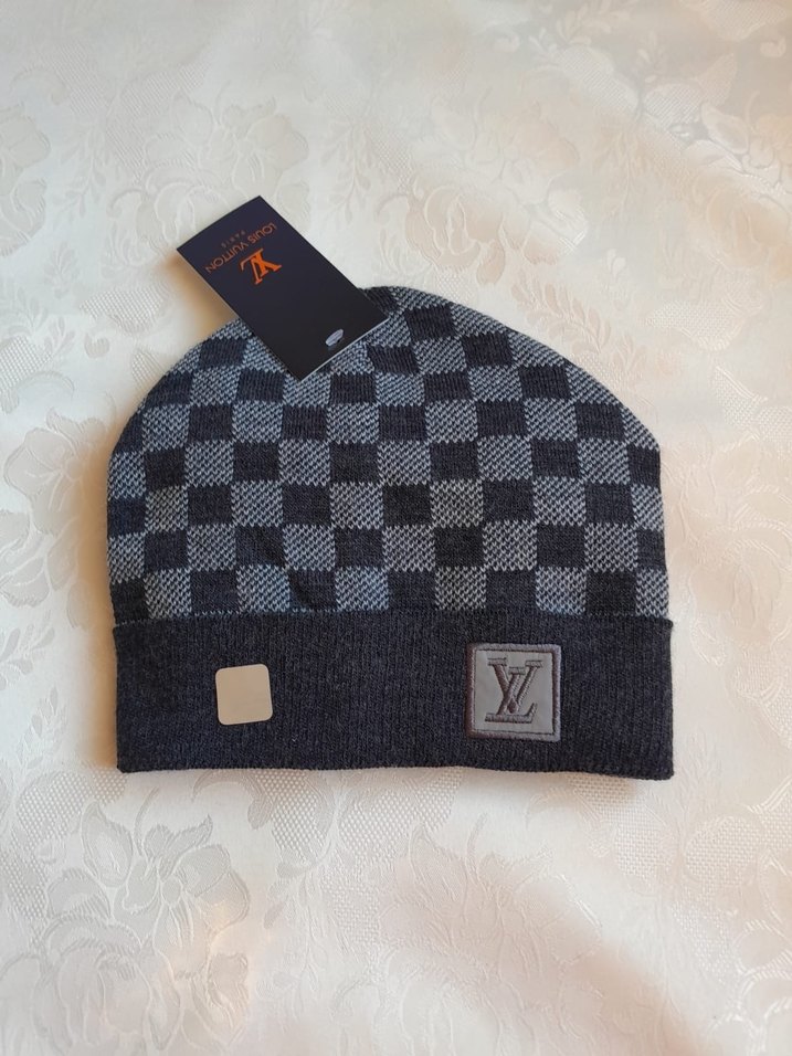 gri kareli örgü bere, rahat örgü kumaş ve sokak stiliyle birleşir. Trendy günlük kullanıma uygun, küçük marka etiketi bulunur.