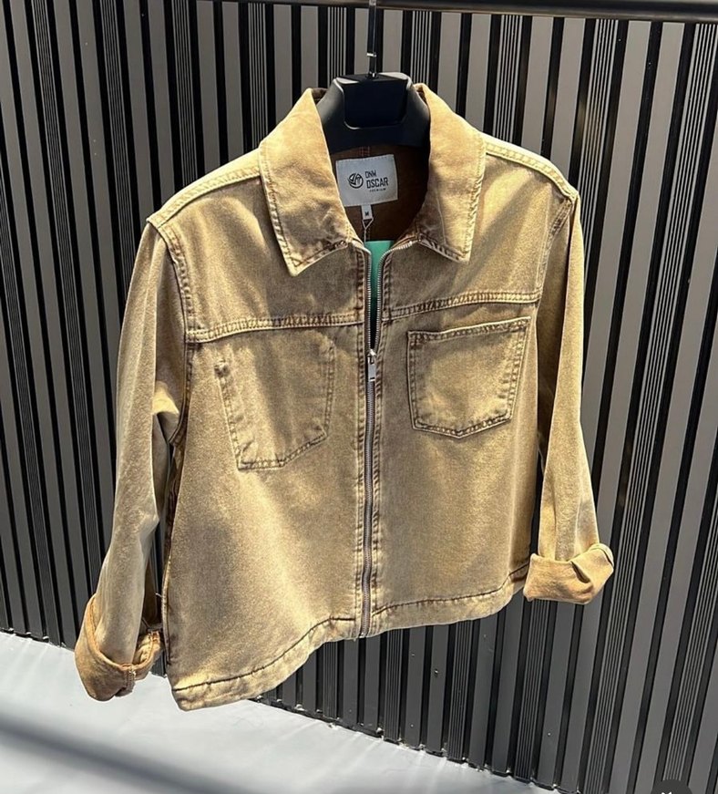 Bej renkli, parlak batik desenli kadın denim ceket. Notlu yaka, uzun kollu ve fermuarlı, bol kesim, günlük kullanıma uygun.