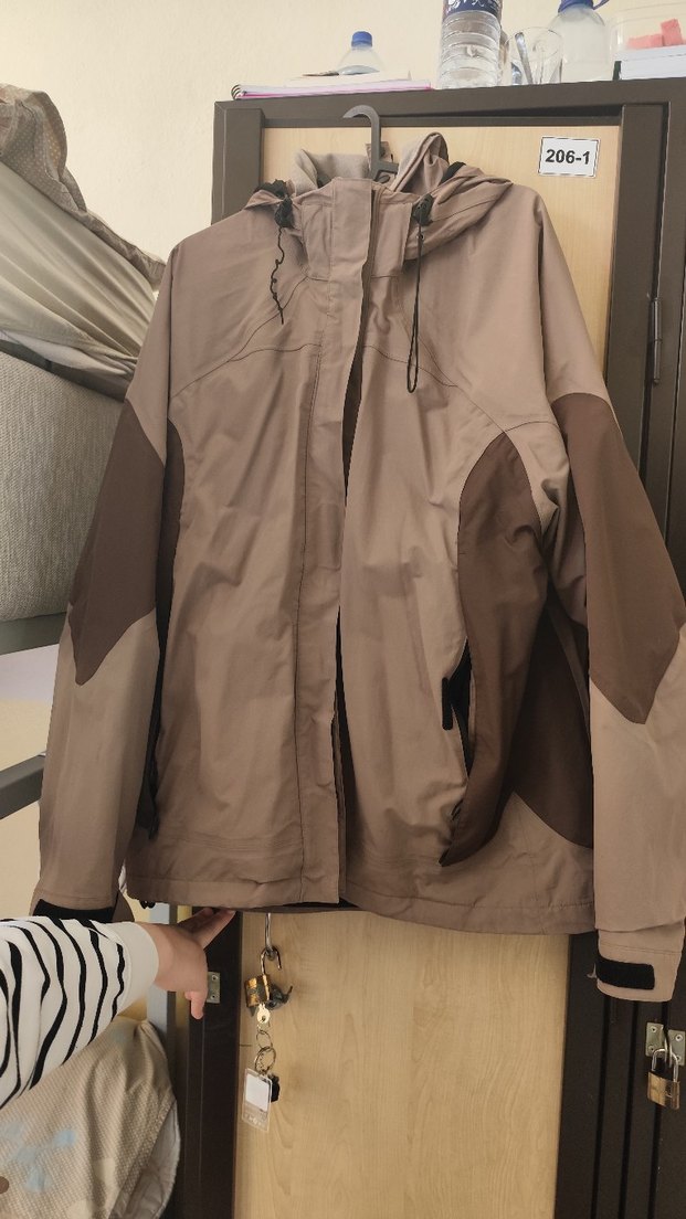 unisex için kahverengi ve gri tonlarında, fermuarlı ve kesik yaka detaylı, uzun kollu, midi boy bol kesim rüzgarlık mont. Günlük kullanıma uygun sentetik kumaş.