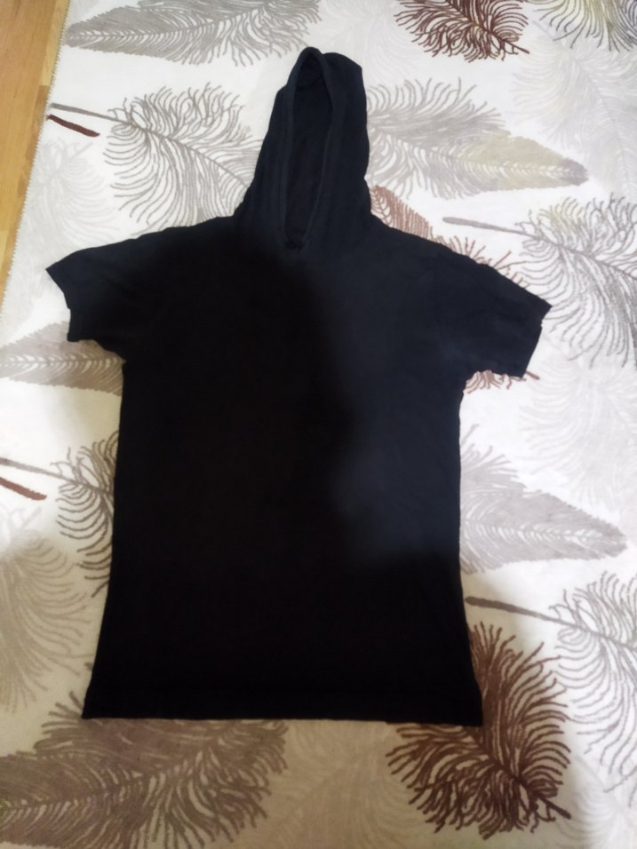 unisex siyah kısa kollu, kapüşonlu tişört. Sentetik kumaştan, bol kesim ve yuvarlak yakalıdır. Sokak modasına uygun, desen içermeyen koyu renkli rahat bir modeldir. penye ölçüleri görselde mevcut m l beden uyumlu